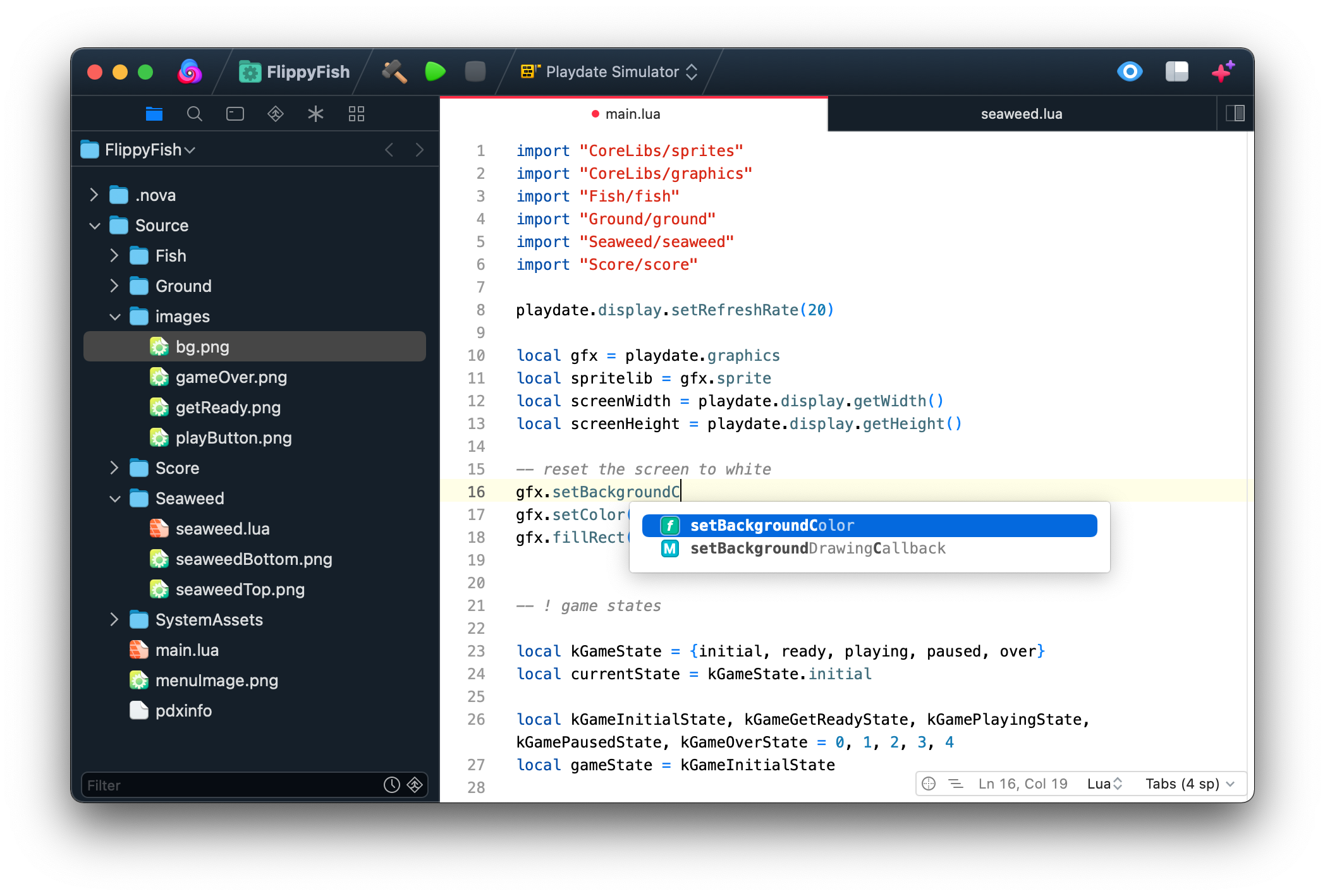 This extension provides Lua syntax completions for the Playdate API, and Tasks that make it easy to build and run your project in the Playdate Simulator on macOS.