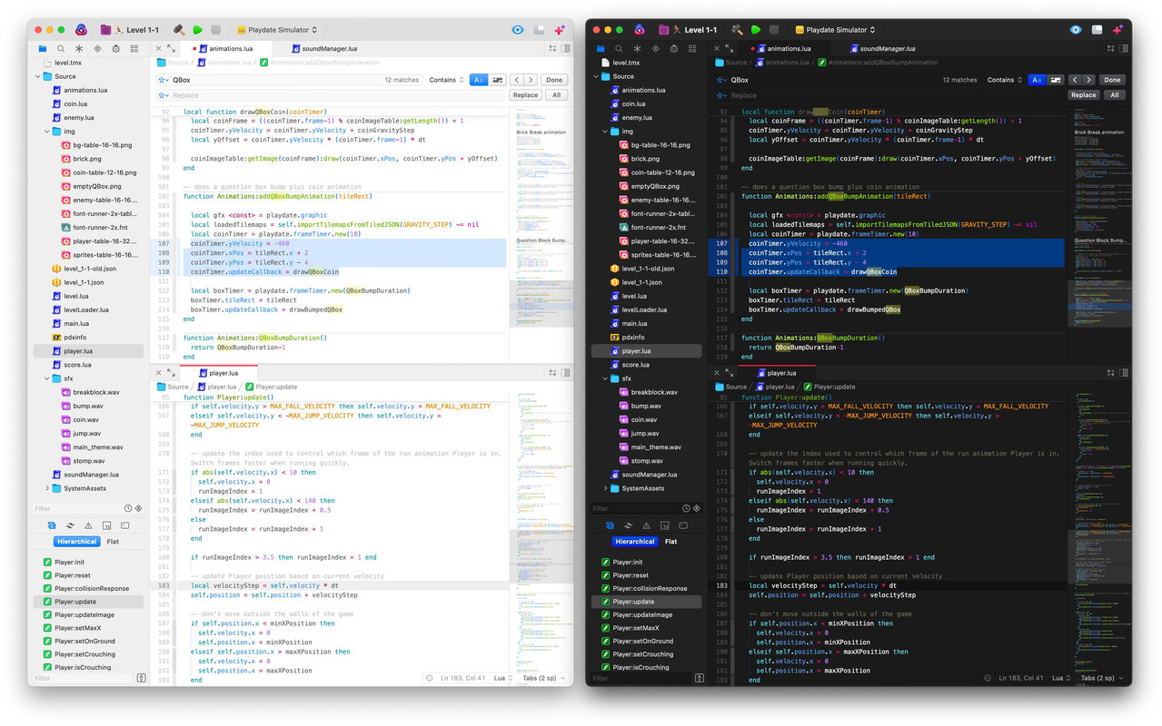 Everything's been tweaked to be nicer than ever! Now includes a bright and sparkling Novakai Days light theme to complement the deliciously dark Novakai Nights. - Greatly improved JSX and Typescript. - Gorgeous HTML and CSS. - Fine tuned for Lua Playdate projects. - C, JS, MD, JSON, AllTheThings - looking fab.