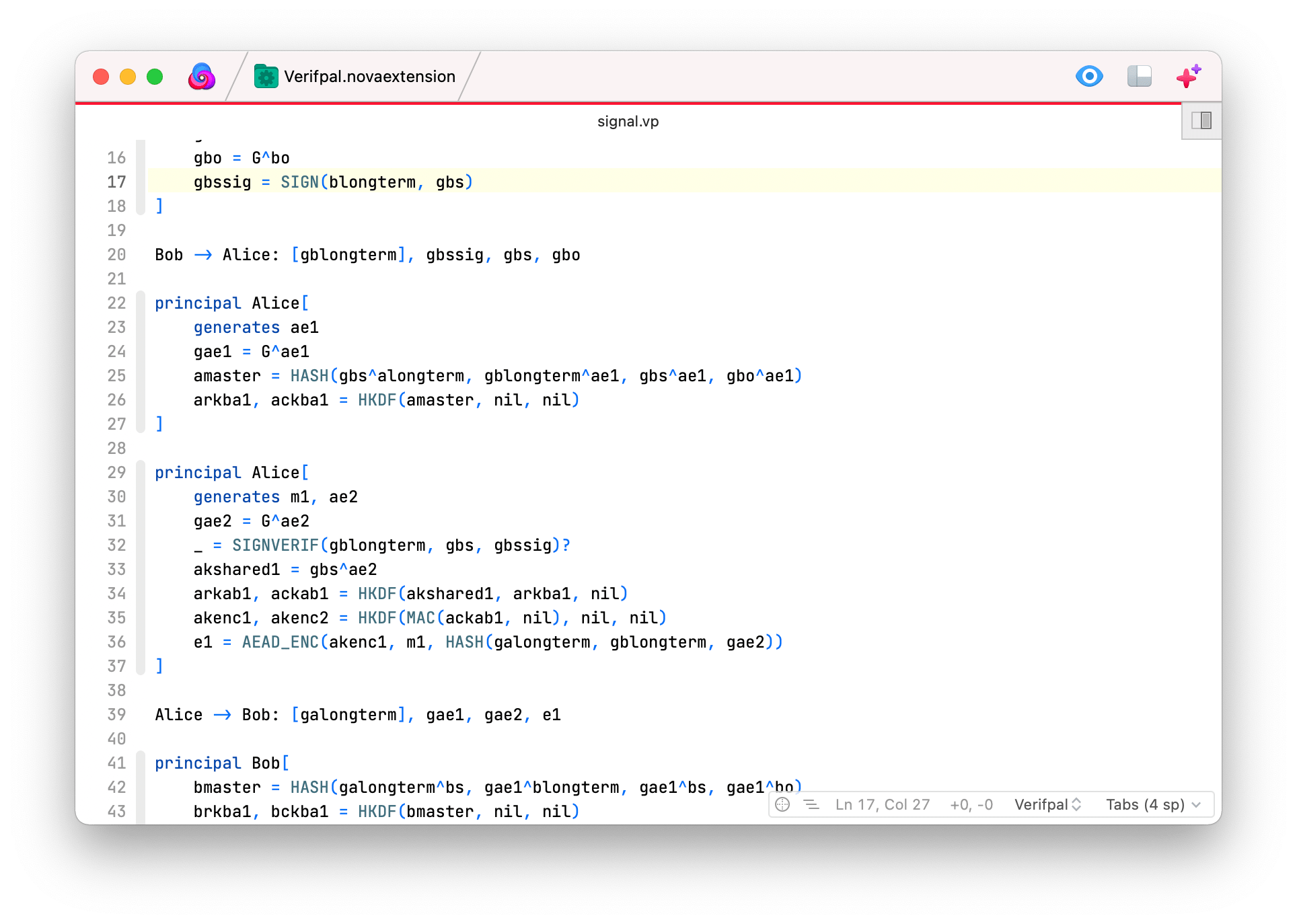 Verifpal provides syntax highlighting for the Verifpal protocol analysis software language.